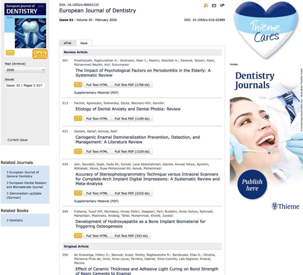 The European Journal of Dentistry is thrilled to share that Volume 20, Issue 1 is now accessible online. We are delighted to offer open access to all our articles. Esteemed for its recognition, the European Journal of Dentistry is listed in prestigious databases like Web of Science (ESCI) (Impact Factor 2.1), SCOPUS (boasting a CiteScore of 4.4), PubMed, PubMed Central, EBSCO, and ProQuest.